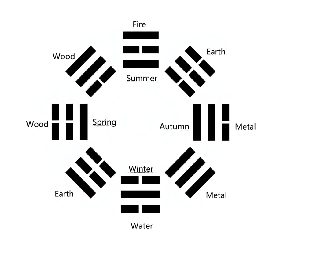 Even within the Eight Trigrams, some elements appear twice—two Trigrams with Wood energy, two with Earth energy, and two with Metal energy—but each pair is different.