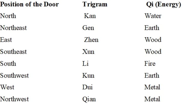 In this series, however, we take a simplified approach. We define the front door’s characteristics based on the qualities of the Qi associated with each Trigram. Looking only from the perspective of the Bagua (the Eight Trigrams), there are eight possible positions for the front door on the Later Heaven Bagua Chart, each linked to one Trigram and its corresponding Qi, as shown below:
