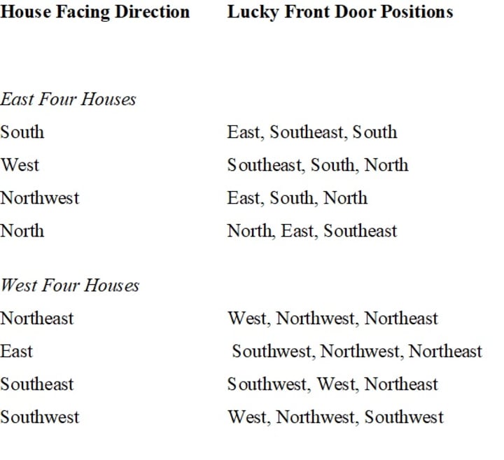 You can use a compass to determine the facing direction of your house, and then identify whether it belongs to the “East Four Houses” or the “West Four Houses.” After defining which group your house belongs to, check the location of the front door. If the front door falls within the same group as the house—either East Four or West Four—then the front door orientation is auspicious. If they belong to different groups, however, there is an underlying inauspicious influence. In the next lecture, we will look at an example.