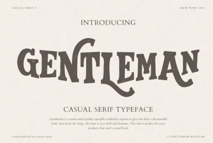 Gentleman is a font that was created specifically for displays that use boldness inside. There are unique curves in this font, making it perfect for matching your design projects with a thrilling adventure.
