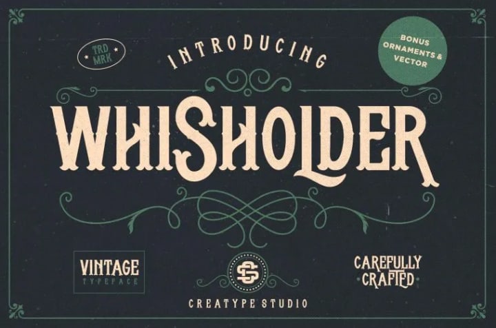 Whisholder is a retro font with beautiful decorative ornaments which is inspired by vintage typefaces and artwork. With a Victorian touch that looks sturdy and bold, it is ready to be used to create vintage letters in a split second.