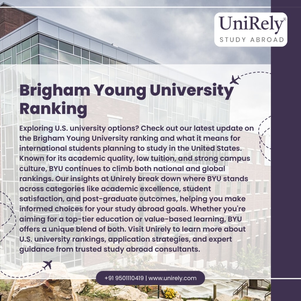 Exploring U.S. university options? Check out our latest update on the Brigham Young University ranking and what it means for international students planning to study in the United States. Known for its academic quality, low tuition, and strong campus culture, BYU continues to climb both national and global rankings. Our insights at Unirely break down where BYU stands across categories like academic excellence, student satisfaction, and post-graduate outcomes, helping you make informed choices for your study abroad goals. Whether you're aiming for a top-tier education or value-based learning, BYU offers a unique blend of both. Visit Unirely to learn more about U.S. university rankings, application strategies, and expert guidance from trusted study abroad consultants.