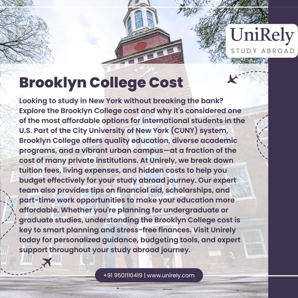 Looking to study in New York without breaking the bank? Explore the Brooklyn College cost and why it's considered one of the most affordable options for international students in the U.S. Part of the City University of New York (CUNY) system, Brooklyn College offers quality education, diverse academic programs, and a vibrant urban campus—at a fraction of the cost of many private institutions. At Unirely, we break down tuition fees, living expenses, and hidden costs to help you budget effectively for your study abroad journey. Our expert team also provides tips on financial aid, scholarships, and part-time work opportunities to make your education more affordable. Whether you're planning for undergraduate or graduate studies, understanding the Brooklyn College cost is key to smart planning and stress-free finances. Visit Unirely today for personalized guidance, budgeting tools, and expert support throughout your study abroad journey.