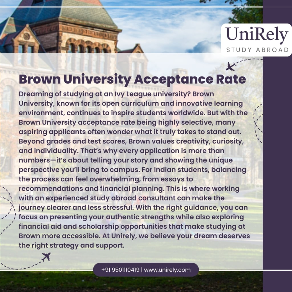Dreaming of studying at an Ivy League university? Brown University, known for its open curriculum and innovative learning environment, continues to inspire students worldwide. But with the Brown University acceptance rate being highly selective, many aspiring applicants often wonder what it truly takes to stand out. Beyond grades and test scores, Brown values creativity, curiosity, and individuality. That’s why every application is more than numbers—it’s about telling your story and showing the unique perspective you’ll bring to campus. For Indian students, balancing the process can feel overwhelming, from essays to recommendations and financial planning. This is where working with an experienced study abroad consultant can make the journey clearer and less stressful. With the right guidance, you can focus on presenting your authentic strengths while also exploring financial aid and scholarship opportunities that make studying at Brown more accessible. At Unirely, we believe your dream deserves the right strategy and support.