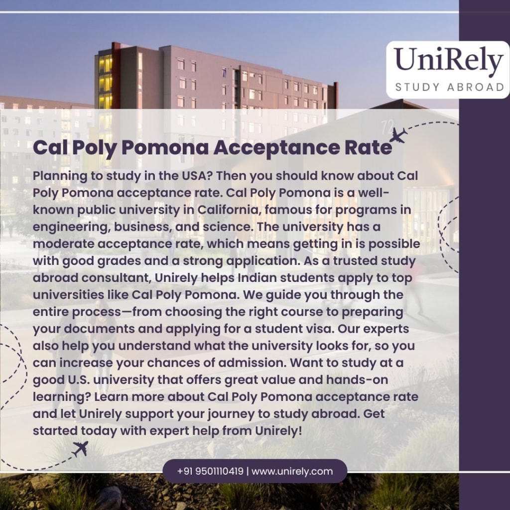 Planning to study in the USA? Then you should know about Cal Poly Pomona acceptance rate. Cal Poly Pomona is a well-known public university in California, famous for programs in engineering, business, and science. The university has a moderate acceptance rate, which means getting in is possible with good grades and a strong application. As a trusted study abroad consultant, Unirely helps Indian students apply to top universities like Cal Poly Pomona. We guide you through the entire process—from choosing the right course to preparing your documents and applying for a student visa. Our experts also help you understand what the university looks for, so you can increase your chances of admission. Want to study at a good U.S. university that offers great value and hands-on learning? Learn more about Cal Poly Pomona acceptance rate and let Unirely support your journey to study abroad. Get started today with expert help from Unirely!