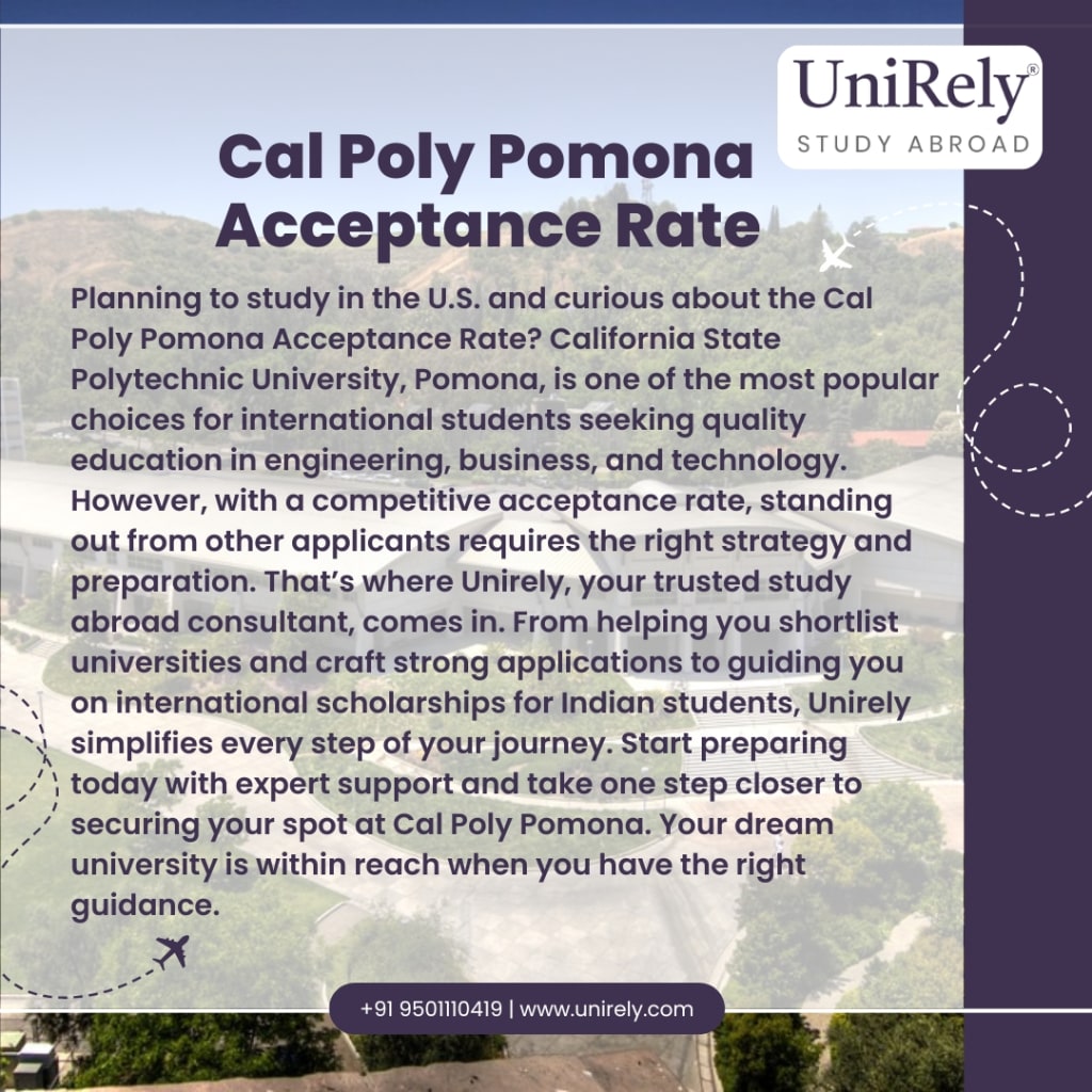 Planning to study in the U.S. and curious about the Cal Poly Pomona Acceptance Rate? California State Polytechnic University, Pomona, is one of the most popular choices for international students seeking quality education in engineering, business, and technology. However, with a competitive acceptance rate, standing out from other applicants requires the right strategy and preparation. That’s where Unirely, your trusted study abroad consultant, comes in. From helping you shortlist universities and craft strong applications to guiding you on international scholarships for Indian students, Unirely simplifies every step of your journey. Start preparing today with expert support and take one step closer to securing your spot at Cal Poly Pomona. Your dream university is within reach when you have the right guidance.
