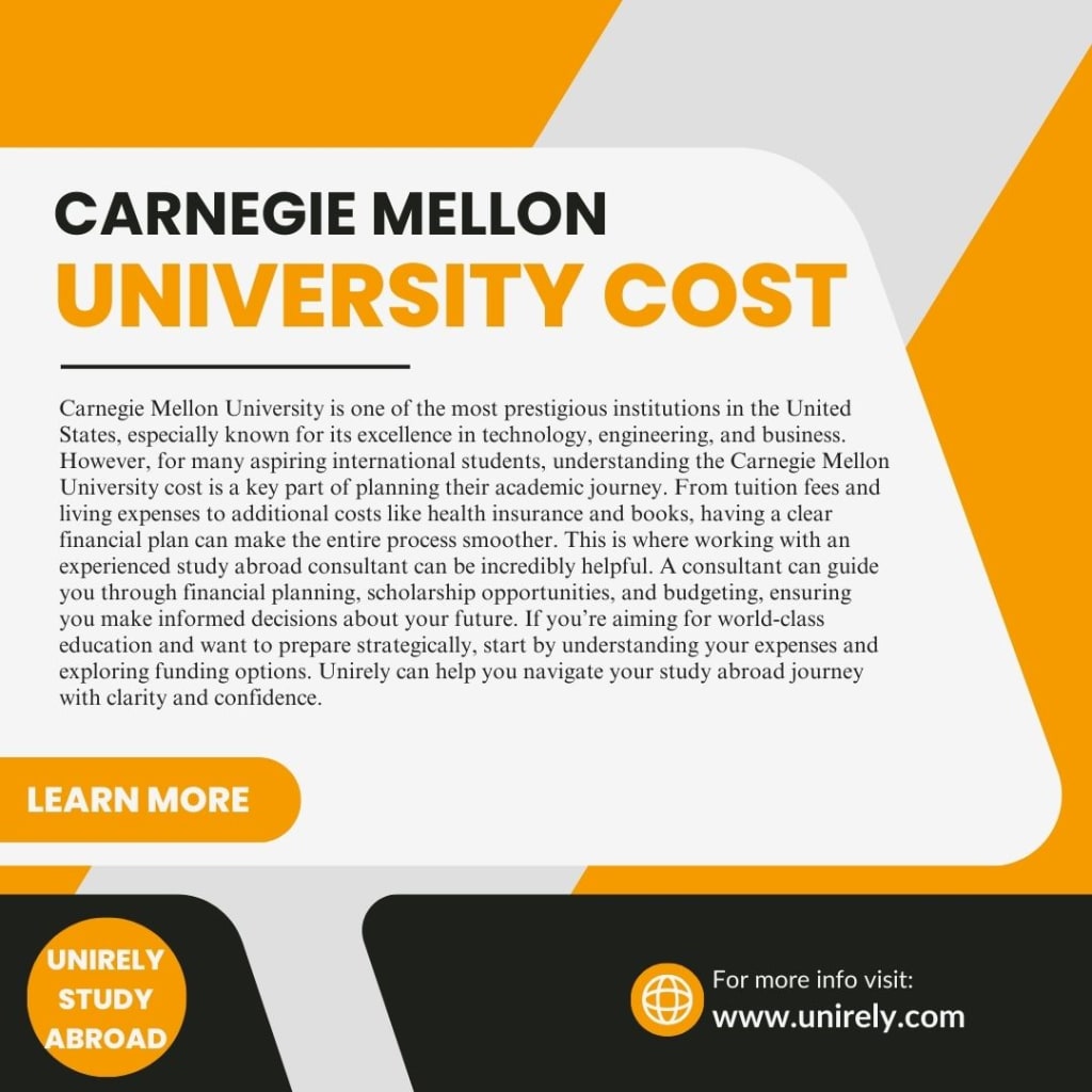 Carnegie Mellon University is one of the most prestigious institutions in the United States, especially known for its excellence in technology, engineering, and business. However, for many aspiring international students, understanding the Carnegie Mellon University cost is a key part of planning their academic journey. From tuition fees and living expenses to additional costs like health insurance and books, having a clear financial plan can make the entire process smoother. This is where working with an experienced study abroad consultant can be incredibly helpful. A consultant can guide you through financial planning, scholarship opportunities, and budgeting, ensuring you make informed decisions about your future. If you’re aiming for world-class education and want to prepare strategically, start by understanding your expenses and exploring funding options. Unirely can help you navigate your study abroad journey with clarity and confidence.