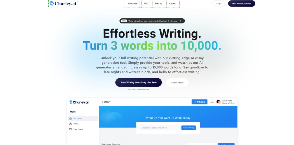 I recently tried out Charley.ai, an online essay writing tool, and I have to say, I was not impressed. Charley.ai claims to use AI technology to help students and professionals write high-quality essays quickly and easily, but in my experience, the tool falls short in several areas. From the pricing plans to the actual quality of the essays, Charley.ai leaves a lot to be desired.