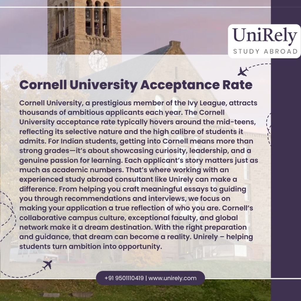 Cornell University, a prestigious member of the Ivy League, attracts thousands of ambitious applicants each year. The Cornell University acceptance rate typically hovers around the mid-teens, reflecting its selective nature and the high calibre of students it admits. For Indian students, getting into Cornell means more than strong grades—it’s about showcasing curiosity, leadership, and a genuine passion for learning. Each applicant’s story matters just as much as academic numbers. That’s where working with an experienced study abroad consultant like Unirely can make a difference. From helping you craft meaningful essays to guiding you through recommendations and interviews, we focus on making your application a true reflection of who you are. Cornell’s collaborative campus culture, exceptional faculty, and global network make it a dream destination. With the right preparation and guidance, that dream can become a reality. Unirely – helping students turn ambition into opportunity.