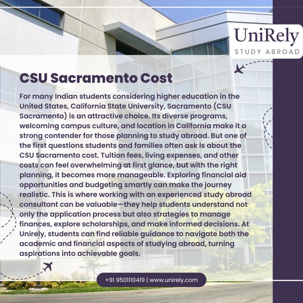 For many Indian students considering higher education in the United States, California State University, Sacramento (CSU Sacramento) is an attractive choice. Its diverse programs, welcoming campus culture, and location in California make it a strong contender for those planning to study abroad. But one of the first questions students and families often ask is about the CSU Sacramento cost. Tuition fees, living expenses, and other costs can feel overwhelming at first glance, but with the right planning, it becomes more manageable. Exploring financial aid opportunities and budgeting smartly can make the journey realistic. This is where working with an experienced study abroad consultant can be valuable—they help students understand not only the application process but also strategies to manage finances, explore scholarships, and make informed decisions. At Unirely, students can find reliable guidance to navigate both the academic and financial aspects of studying abroad, turning aspirations into achievable goals.