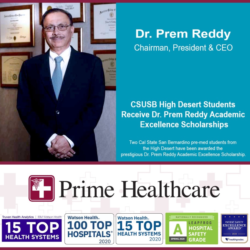 Two Cal State San Bernardino pre-med students from the High Desert have been awarded the prestigious Dr. Prem Reddy Academic Excellence Scholarship.