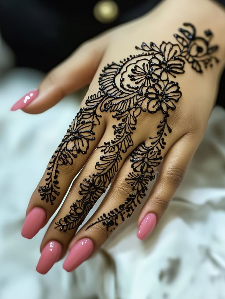 Arabic mehndi on the back hand tends to have minimal designs on the fingers, often leaving them mostly blank or lightly decorated with small patterns like dots or lines.