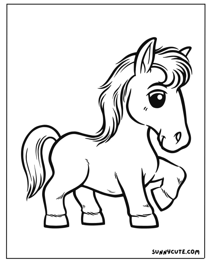 A tiny pony with big, sparkling eyes and a fluffy mane is perfect for younger kids. This style is cute, simple, and easy to color. Add hearts, stars, or little butterflies around the pony to make it even more fun. It’s an excellent option for preschoolers and toddlers who are just getting into coloring.