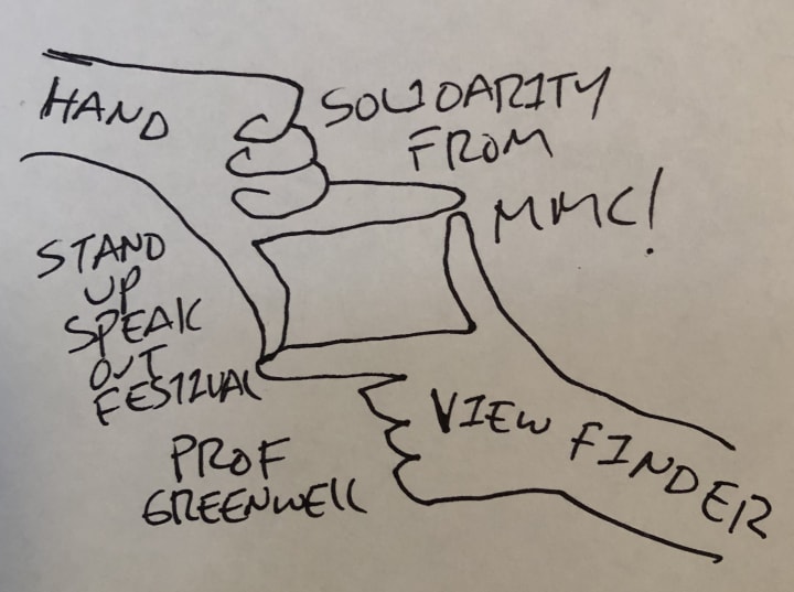Every year, Erin curates the "Stand Up Speak Out" festival at Marymount. It's an art festival where students collaborate with the incarcerated women to create original films, dances, monologues, and drawings. Last year, the poetry and storyboards made by the Bedford Hills women during their Politics of Human Spaces and poetry courses were adapted into art pieces by the MMC community. Erin sent many emails about the event, and tried to get clubs and faculty members to promote it if possible. The day of the festival, so many people flocked to see the show, some audience members chose to stand because the performance space ran out of chairs.