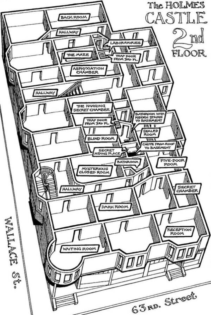 Holmes was a master of fraud. Insurance fraud to be exact. He was also known for stiffing multiple construction crews and architects mid-build so no one EVER had all the blueprints to know all the rooms built there.