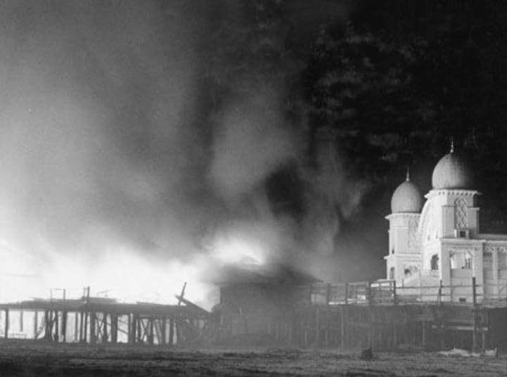 However, in 1925 a fire broke out destroying much of the building, and nearby structures. The roller coaster survived the massive fire.