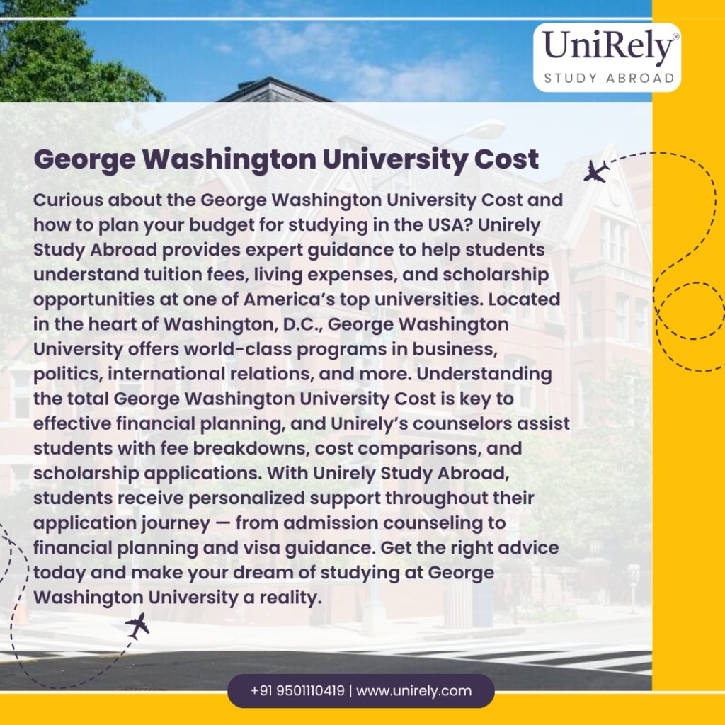 Curious about the George Washington University Cost and how to plan your budget for studying in the USA? Unirely Study Abroad provides expert guidance to help students understand tuition fees, living expenses, and scholarship opportunities at one of America’s top universities. Located in the heart of Washington, D.C., George Washington University offers world-class programs in business, politics, international relations, and more. Understanding the total George Washington University Cost is key to effective financial planning, and Unirely’s counselors assist students with fee breakdowns, cost comparisons, and scholarship applications. With Unirely Study Abroad, students receive personalized support throughout their application journey — from admission counseling to financial planning and visa guidance. Get the right advice today and make your dream of studying at George Washington University a reality.