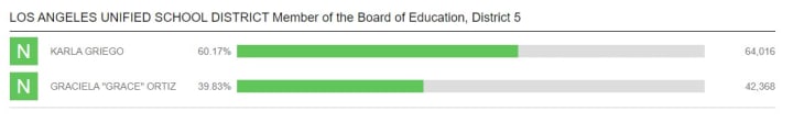 In the first report from the Los Angeles County Clerk, Ortiz secured only 38.6% of the vote. This morning that margin had increased slightly to 39.83%. Of the 106,384 votes counted, Special Education teacher Karla Griego has a 21,648 vote lead and is the likely winner.