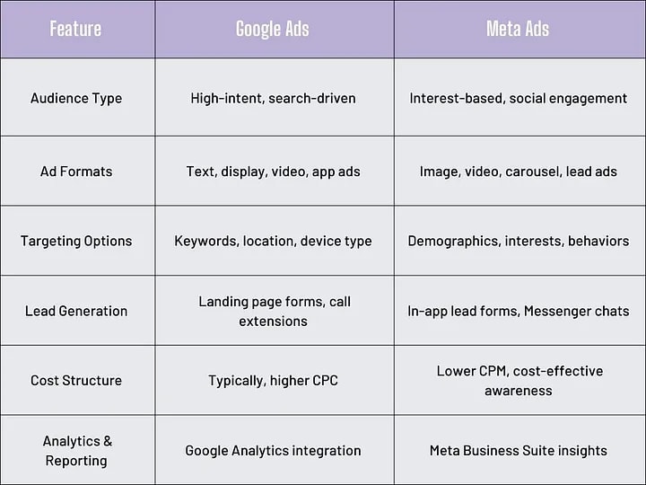 Google Ads targets active search volume, whereas Meta Ads cultivates audiences and generates interest through compelling, visual content.