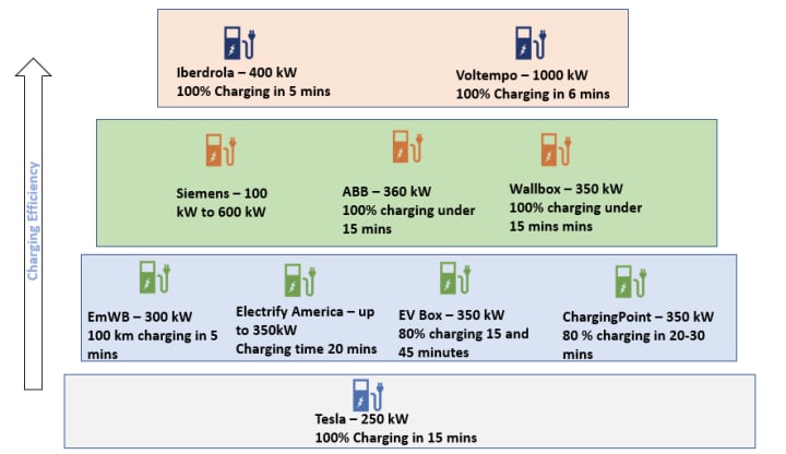 In 2022, Voltempo a leading technology developer of electric automakers launched its HyperCharging. As per the company, the HyperCharging system can deliver 1,000kW of power which is around 2.8 times more than the power delivered by the other comparable charging stations. This solution is able to charge the compatible electric vehicle within 6 minutes and has a unique capability of charging 24 vehicles simultaneously. Through its demonstration, the charging system looks promising for now and Voltempo has further stated that it will be able to build a charging system with the efficiency that could match a similar time that it takes to refuel a conventional, petrol-driven vehicle. Another prominent company, Iberdrola has launched an ultra-fast charging hub for electric vehicles having a capacity of up to 400 kW and is capable of recharging car batteries in less than five minutes and can charge up to 16 vehicles simultaneously.
