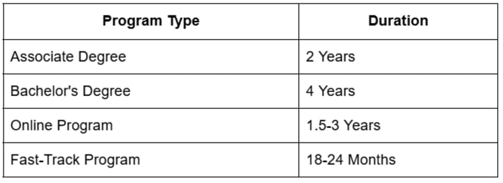 - Fast-Track Programs: Require intense study and may be completed in as little as 18 months.