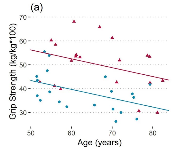 As age increments, hold strength goes down. Men (mysteriously in pink) have higher hold strength in general, and ladies (confusingly in blue) lower. Fairly less solid connections were seen for knee strength.