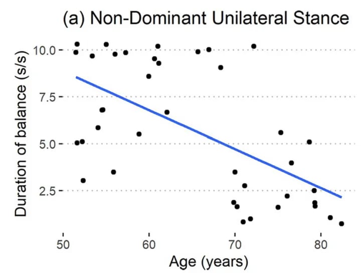 Especially for the non-prevailing leg, what you see here is a really emotional drop-off in balance time around age 65, with more youthful individuals ready to complete 10 seconds easily, and a few more seasoned individuals scarcely having the option to come to 2.