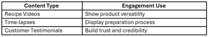 - Recipe Videos: Short, step-by-step tutorials using your products.