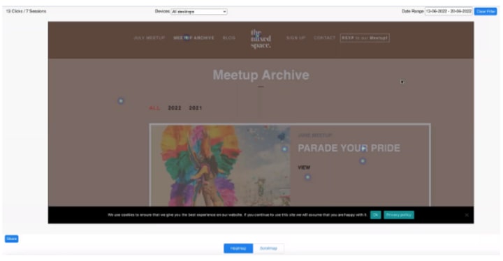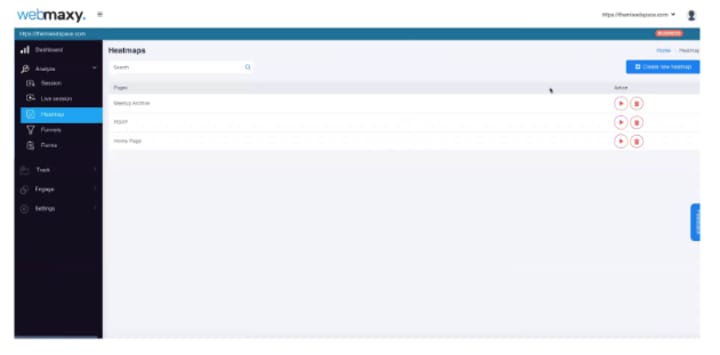 Heatmaps are a visual representation of where your visitors click when they get on your website. Navigate to Analyze>Heatmap and click on the “Create a heatmap” button at the top right. Follow the on-screen instructions and let Webmaxy collect behavioral data for some time.