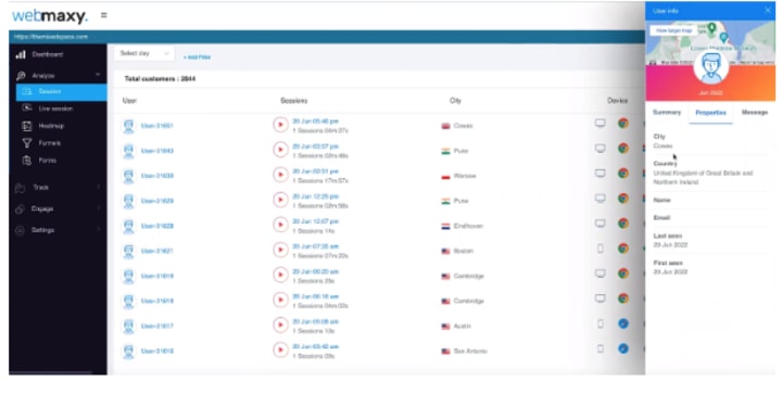Details like the location of the user, the session time, and the browsing device details are also available. To watch the recordings, click on the red play button.