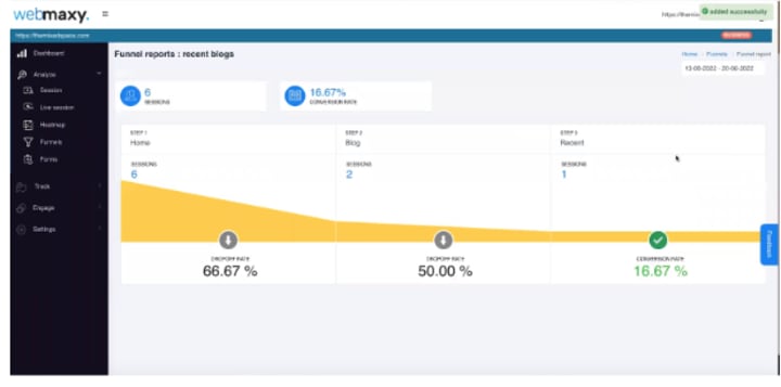 If you have conversion funnels or are testing new ones out, you can examine their efficiency with Webmaxy. By tracking the drop-off at each step, you can find the weak points you need to improve on your customer journey map.