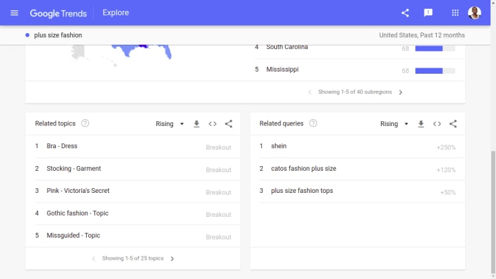 Of interest is the ‘related topics’ section. Look for a distinct angle. In the above Google Trends example, ‘missguided’ seems intriguing. While it may be a brand name, it is a homophone to ‘misguided’. Do you remember our hypothesis about plus size fashion being unintentionally forgotten?