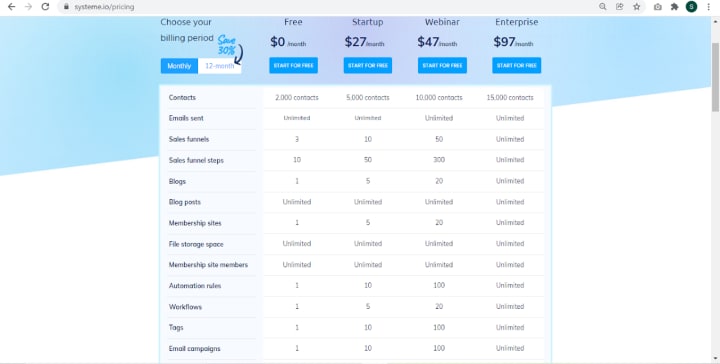 Systeme.io’s free plan is perfect for early-stage startups and bootstrapped small businesses. With the free plan, you can build one sales funnel, send unlimited emails to up to 2000 contacts, build a course site, and much more.