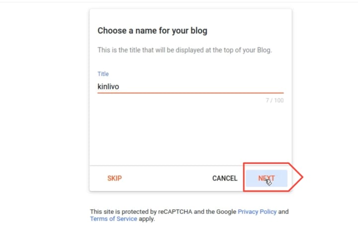 4. After you sign in, a pop-up window will prompt you to name your blog. In the text field, click the "Title" button. To proceed, enter your blog title in the text field and click next.