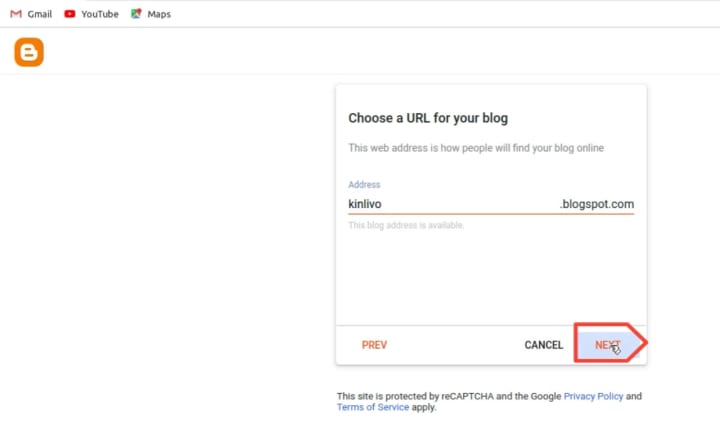 - If the next button in the pop-up window's bottom right corner turns orange, it means you can use this address for your blog. To proceed, click the next button.