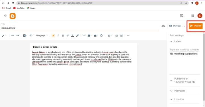 - To publish your Post, click the "Publish" button in the upper right corner. (Click the "Preview" button to see a preview of your post before publishing it).