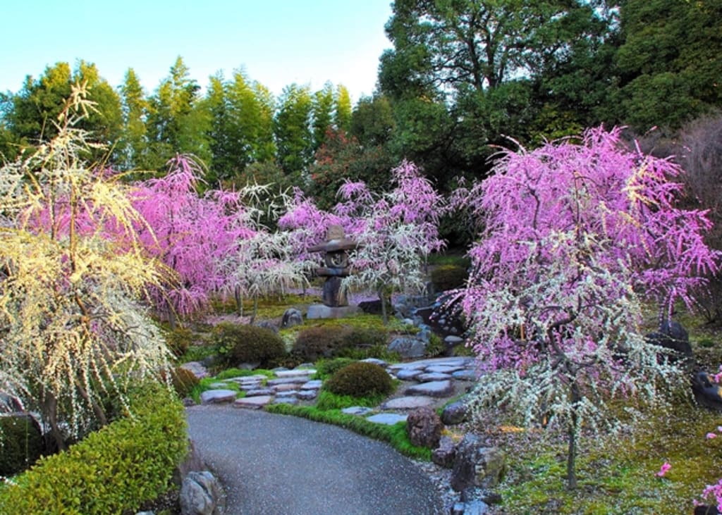 "Spring Mountain" is built on a gentle hill. When the weeping plums are in full bloom, the branches pour down, and when the flowers fall, the hills are covered with plum petals. In addition, the road from the entrance of the garden to "Spring Mountain" and "Heian Garden" is full of various camellias, which is unique. From late February to mid-March, while admiring the plum blossoms, people can see the camellias falling from the moss piece by piece. Hiroshi Yamamoto of the Joanna Palace Propaganda News commented, "When the flowers bloom, you can enjoy the flowers blooming in the wind, and when the flowers fade, you can enjoy the carpet of petals. The scenery changes with the seasons. Visitors can come multiple times in different seasons."