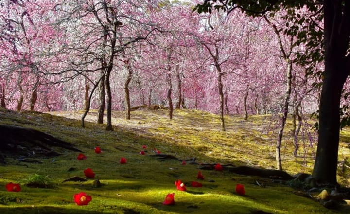 About 80 kinds of flowers and plants appear in "The Tale of Genji", and they bloom with each other throughout the year, as if to represent each season. Among them, the plum blossoms that bloom in the cold are the first flowers to transmit new buds. When the plum blossoms of the "Jonan-gu” Shrine are in full bloom, it means that spring has arrived. At this time, people will go to the place with the mood of welcoming spring and be immersed in the world of flowers, smelling the sweet and sour fragrance, watching camellias fall.