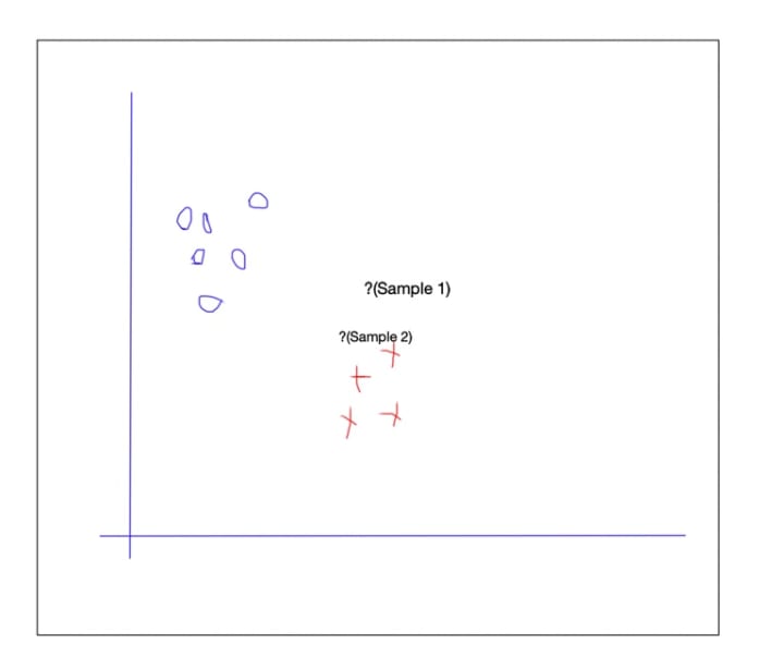We have 2 class classification problem, represented in 2 dimensions, samples in the first class and second class. Given a new sample, we need to identify whether the class is class 1 or class 2.