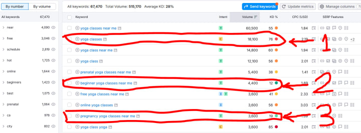 The picture above demonstrates the basic use of keyword research tools. The seed keyword I used is "yoga classes". I will explain each section accordingly.