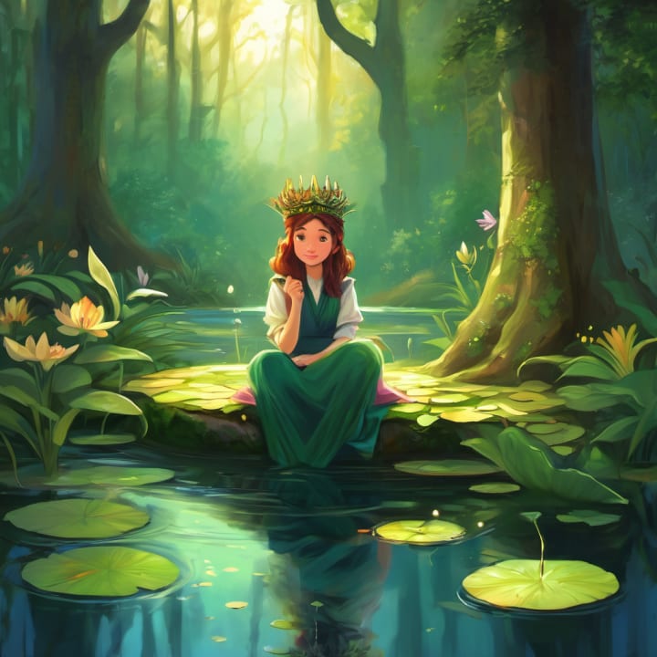 As she wandered deeper into the forest, Lily stumbled upon a quiet pond. In the middle of the pond, a tiny frog wearing a little crown sat perched on a lily pad. The frog introduced himself as Fredrick, the wise ruler of the forest. He noticed Lily's boundless creativity and told her that he needed her help. Fredrick explained that an evil sorceress had cast a spell over their magical forest, draining it of all its colors, sounds, and beauty. The forest had turned dull and lifeless. The animals and plants that once danced with vibrancy were now sad and gloomy