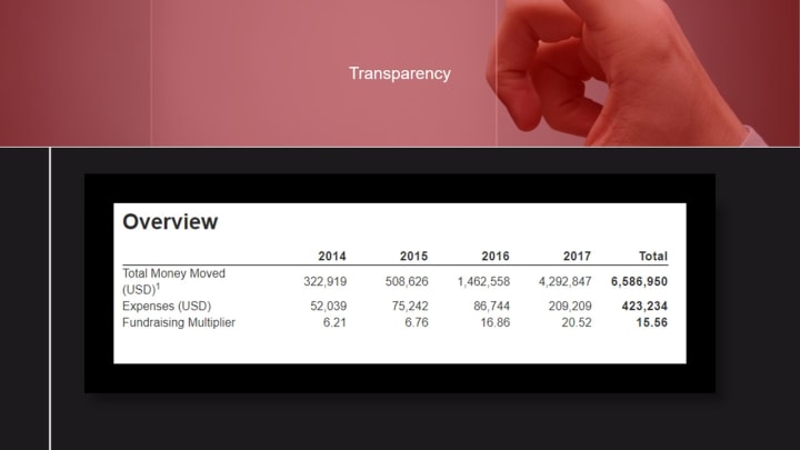 The charity was founded on the third of July 2014 by a set of internationally acclaimed Poker players including, Liv Boeree, Igor Kurganov, Phil Gruissem, and Stefan Huber. Since 2014 the organisation has raised over $6.5 million with around $3 million being donated to alleviate global poverty. The group intends to be completely transparent, publishing biannual transparency reports to the public to demonstrate their progress and spending. As shown below REG has dramatically increased both the amount of money raised and the fundraising multiplier attached to these contributions, attempting to keep the organisations spending to a minimum.