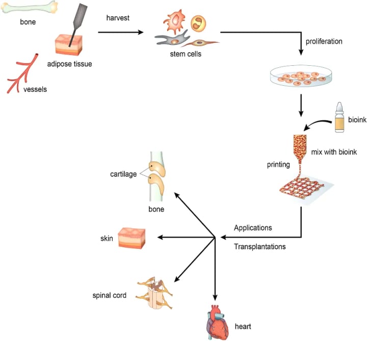The process of building 3D scaffolds and culturing stem cells on these scaffolds enhanced the regenerative potential of stem cells in bone and cartilage injuries. The vast majority of tissues contain more than one type of cell and structures that consist of multiple layers. It is therefore necessary to have multi-layered 3D scaffolds in the process of constructing engineered tissues from stem cells. At present, 3D bioprinting has gained attention in the field for the development of multi-layered constructs. Indeed great development has been achieved in 3D Bioprinters based tissue engineering. Utilizing 3D bioprinting different types of cells can be placed in certain areas in multilayered constructs for building different tissues or organs. Bioprinting techniques include the use of inkjet and laser deposition.