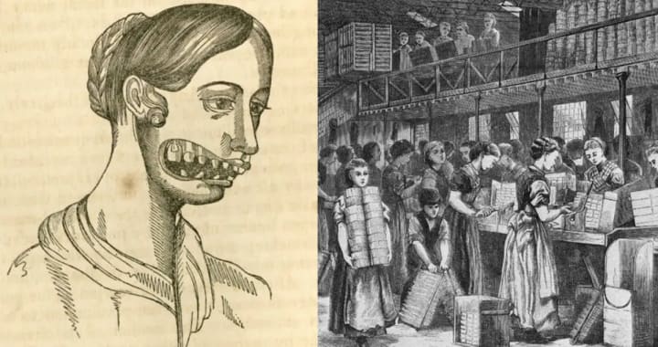 Making matchsticks was one particularly filthy task that women and children performed that caused them to glow in the dark. Additionally, it contributed to "phossy jaw," a condition that results in the jaw bone dying due to phosphorus toxicity.