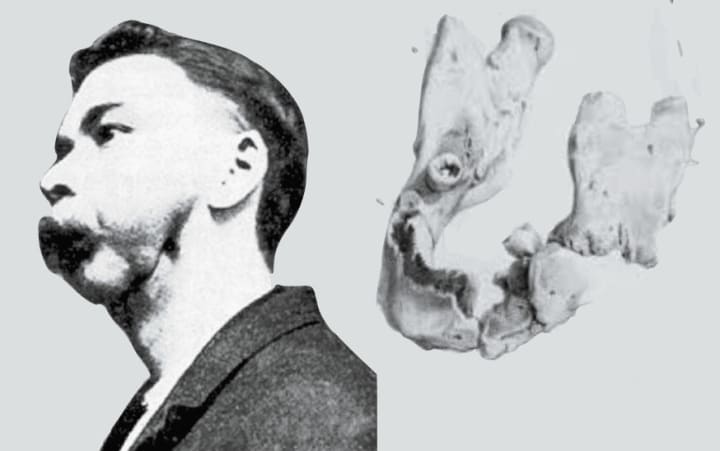 The illness is essentially an infection of the mandible caused by persistent phosphorus exposure. The left side of this adolescent's mandible has extensive damage and a peculiar bone mass in the center.