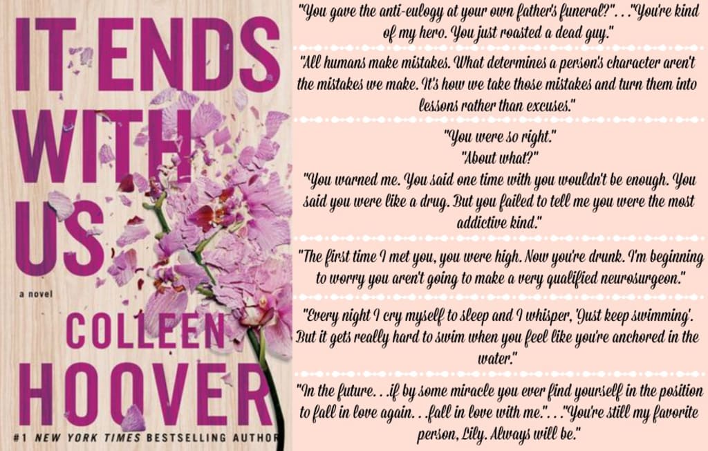 Overall, "It Ends With Us" is a novel that left a lasting impression on me. It's a must-read for contemporary romance lovers who are looking for a story that is both emotional and thought-provoking. Colleen Hoover's writing is powerful, insightful, and deeply moving. The book is a powerful, emotional, and thought-provoking read that will leave an impact on me long after I have finished reading it. It is definitely my favourite book of all time.