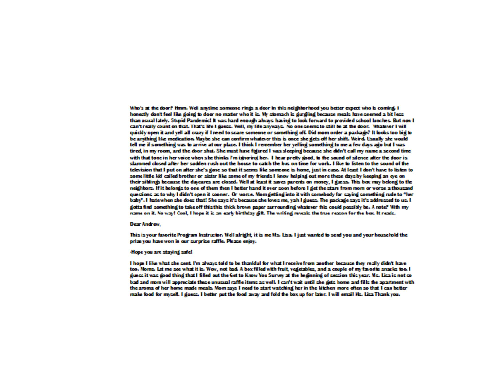 Who’s at the door? Hmm. Well anytime someone rings a door in this neighborhood you better expect who is coming. I honestly don’t feel like going to door no matter who it is. My stomach is gurgling because meals have seemed a bit less than usual lately. Stupid Pandemic! It was hard enough always having to look forward to school provided lunches. But now I can’t really count on that. That’s life I guess. Well, my life anyways. No one seems to still be at the door, whatever I will quickly open it and yell all crazy if I need to scare someone or something off. Did mom order a package? It looks too big to be anything like medication. Maybe she can confirm whatever this is once she gets off her shift. Weird. Usually she would tell me if something was to arrive at our place. I think I remember her yelling something to me a few days ago but I was tired, in my room, and the door shut. She must have figured I was sleeping because she didn’t call my name a second time with that tone in her voice when she thinks I’m ignoring her. I listen alright, to the sound of silence after the door is slammed closed once she's made her sudden rush out to catch the bus on time for work. I like to listen to the sound of the television I put on after she’s gone so it seems like someone is home, just in case. You know? Well at least I don’t have to listen to some little kid called brother or sister like some of my friends I know, helping out more these days by keeping an eye on their siblings because daycare centers are closed. Saves parents their money, I guess. This box may belong to the neighbors. If it belongs to one of them then I better hand it over soon before I get the stare from mom or worse a thousand questions as to why I didn’t open it sooner. Or worse. Mom getting into it with somebody for saying something she would consider rude to “her baby”. I hate when she does that! She says it’s because she loves me, well I guess. The package is addressed to us. I gotta find something to take off this thick brown paper surrounding whatever this could possibly be. There's a note. With my name on it? No way! Cool, I hope it is an early birthday gift. The writing reveals the true reason for the box... It reads.