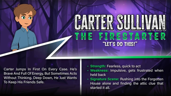 Carter jumps in first on every case. He’s brave and full of energy, but sometimes acts without thinking. Deep down, he just wants to keep his friends safe.