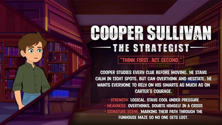 Cooper studies every clue before moving. He stays calm in tight spots, but can overthink and hesitate. He wants everyone to rely on his smarts as much as on Carter’s courage.