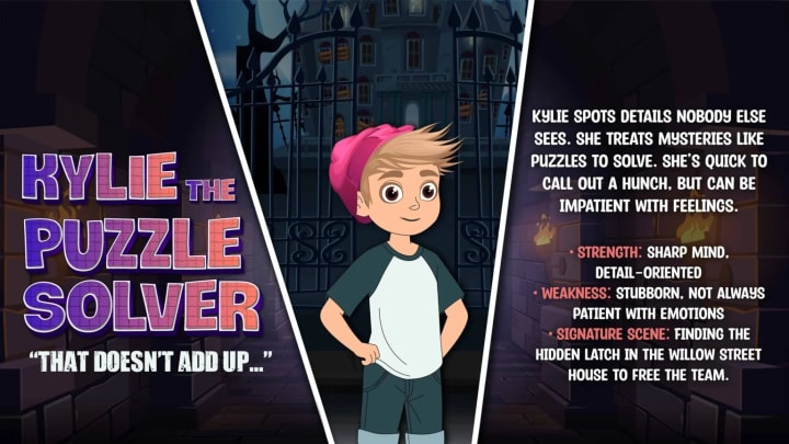 Kylie spots details nobody else sees. She treats mysteries like puzzles to solve. She’s quick to call out a hunch, but can be impatient with feelings.